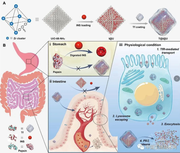 近日,Science雜志子刊Science Advances在線發(fā)表了武漢大學藥學院教授田間課題組在胰島素口服遞送方面的研究成果。該研究設計并發(fā)展了一種基于耐酸性金屬有機骨架材料的口服胰島素納米制劑,它可以有效克服胰島素口服吸收的多重屏障,顯著提高了胰島素的口服生物利用度。基于耐酸性金屬有機骨架的口服胰島素納米制劑的構建及其吸收機制示意圖糖尿病是危害人類健康的第三大殺手,具有高患病率、殘疾率和死亡率,全球范圍內患病人數超過4.7億,每年產生的醫(yī)療費用高達7000多億美元。其中,I 型糖尿病和部分II 型糖尿病患者的治療依賴于每日皮下注射胰島素,但長期皮下注射給患者帶來了極大的痛苦。與注射相比,口服制劑用藥簡單且具有良好的患者依從性,若能實現胰島素的口服遞送,將取得糖尿病治療的革命性進步。然而,胰島素、抗體、蛋白等大分子藥物在胃腸道中的不穩(wěn)定性和吸收差等問題嚴重阻礙了口服胰島素的臨床研究與發(fā)展。鑒于此,田間課題組創(chuàng)新性地利用靶向蛋白包被的耐酸性金屬有機骨架納米材料來實現胰島素口服遞送。金屬有機骨架納米載體的多孔及高度有序結構實現了蛋白質藥物的高負載量。同時,耐酸性金屬有機骨架不僅可以作為“盔甲”保護負載的蛋白質免受胃酸環(huán)境和消化酶的影響,還表現出可控制釋放的特性,僅在吸收入體循環(huán)后的生理條件下分解并釋放胰島素。更重要的是,金屬有機骨架易于修飾的特性使轉鐵蛋白在納米粒子表面形成蛋白冠,其能與腸上皮細胞廣泛表達的轉鐵蛋白受體相結合,通過受體介導的跨細胞途徑遞送胰島素,成功克服了腸上皮細胞吸收屏障。該團隊在患有1型糖尿病的大小鼠模型上驗證了金屬有機骨架納米制劑口服遞送胰島素的效能,發(fā)現該類制劑能有效的調節(jié)血糖水平長達10小時,并成功將胰島素在大鼠體內的口服生物利用度提高至29.6%。此外,這類口服納米遞藥系統(tǒng)生物相容性良好,制備路線經濟便捷,具有進一步臨床轉化的潛力。負載熒光標記胰島素的金屬有機骨架口服納米制劑在生物體內的分布該研究表明,功能性金屬有機骨架納米顆??梢杂行ПWo蛋白質免受胃環(huán)境的影響并克服多重口服屏障,為口服生物大分子遞送提供了新策略及理論依據。該研究題目為“Efficientoralinsulindeliveryenabled bytransferrin-coatedacid-resistantmetal-organicframeworknanoparticles”(《轉鐵蛋白包被的耐酸性金屬有機骨架納米顆粒實現高效口服胰島素遞送》)。武漢大學藥學院2020級博士研究生鄒俊捷為第一作者,武漢大學田間和美國北德克薩斯大學教授馬勝前為共同通訊作者。武漢大學為論文第一署名單位和通訊單位。該研究得到了國家自然科學基金、中央高校基本科研專項基金等項目資助。論文鏈接:https://www.science.org/doi/10.1126/sciadv.abm4677