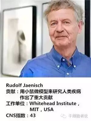 Jaenisch曾在1974年成功構(gòu)建出第一只轉(zhuǎn)基因小鼠,由此改變了遺傳學的研究模式。2013年他在Cell雜志上發(fā)表了一項研究成果,將再次徹底改變遺傳工程動物模型的構(gòu)建方式,甚至有可能重新定義哪些物種可作為模式生物(《Cell》發(fā)表革命性基因組工程技術成果)。