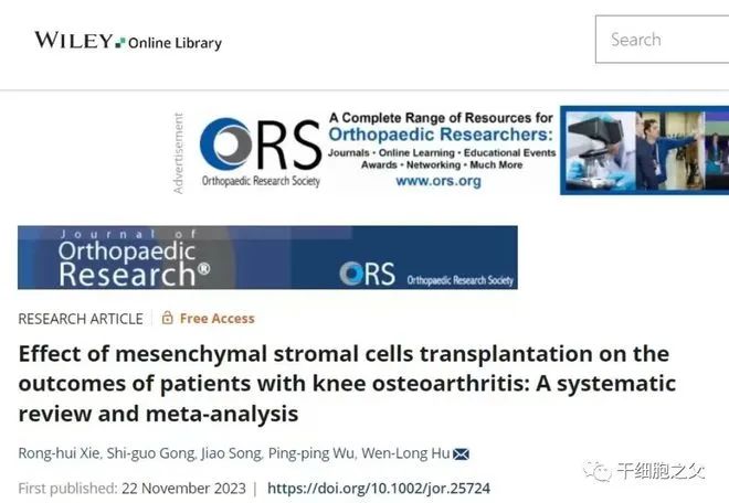 2023年11月22日,一項最新的關于膝骨關節(jié)炎干細胞注射臨床試驗的薈萃分析發(fā)表在Orthopaedic Research《骨科研究雜志》上。該項研究納入了16項符合條件的臨床研究,共有875名膝骨關節(jié)炎(KOA)患者,包括干細胞移植組的441名和對照組的434名。