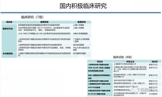 截止2023年4月,國內有8款治療膝骨關節(jié)和半月板損傷的干細胞新藥獲得國家藥品監(jiān)督管理局(NMPA)臨床試驗默示許可,正式進入臨床試驗。根據中國醫(yī)藥生物技術協(xié)會的公示信息,共有7個干細胞治療膝骨關節(jié)和半月板損傷臨床研究備案項目。