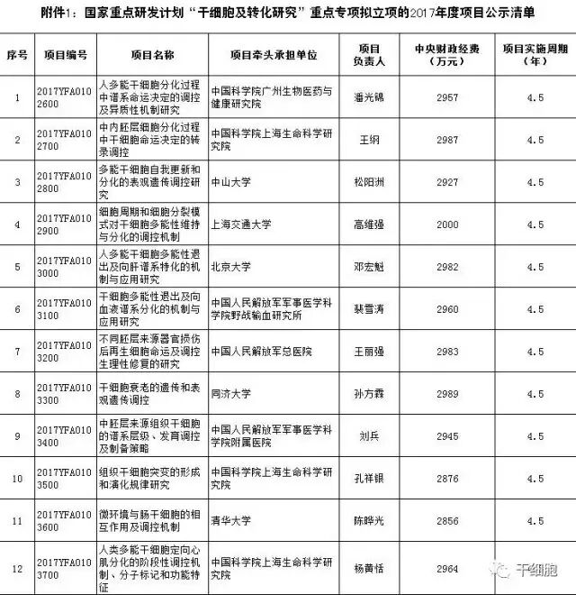 關于國家重點研發(fā)計劃“干細胞及轉化研究”等5個重點專項2017年度項目安排公示的通知